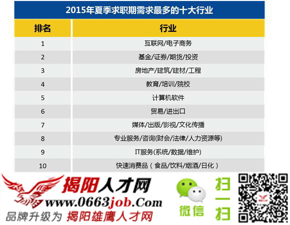 圖為2015年夏季求職需求最多的十大行業,換句話講就是這些行業的發展勢頭較猛,屬于朝陽行業,需要更多優秀人才。相信大部分人都希望可以進入一個朝陽的行業,在風口行業工作比在夕陽行業中努力更容易獲得成功。