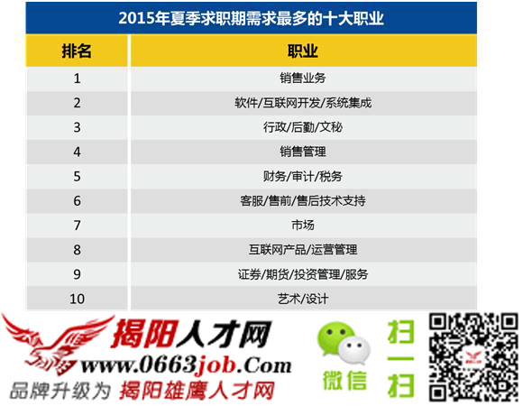 圖為2015年夏季求職期需求最多的十大職業,也就是目前比較稀缺人才的行業,有些職業是企業之中不可或缺的職位,有些職位則是由于行業的蓬勃發展而不斷增加的職位。總之,這些職位決定你未來做什么,選擇時一定要慎之又慎。