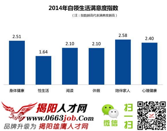 圖為2014年中國白領生活滿意度,中國白領最不滿意的是性生活,滿意度僅為1.64。過半中國白領每月性生活次數低于1次,其中,46.1%為單身;僅有約1/4的中國白領每周至少過1次性生活。加班、工作壓力較大、出差較多的工作有可能會導致陪伴家人/伴侶的時間大大減少,這也是需要大家考慮的因素之一。