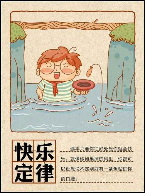 遇事只要你往好處想你就會快樂,就像你如果掉進(jìn)溝里,你都可以設(shè)想說不定剛好有一條魚鉆進(jìn)你的口袋。